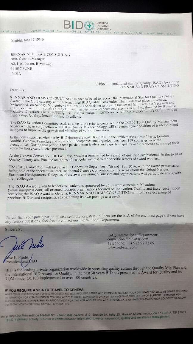 Subject: International Star for Quality (ISAQ) Award for RENNAR AND FRAIS CONSULTING.