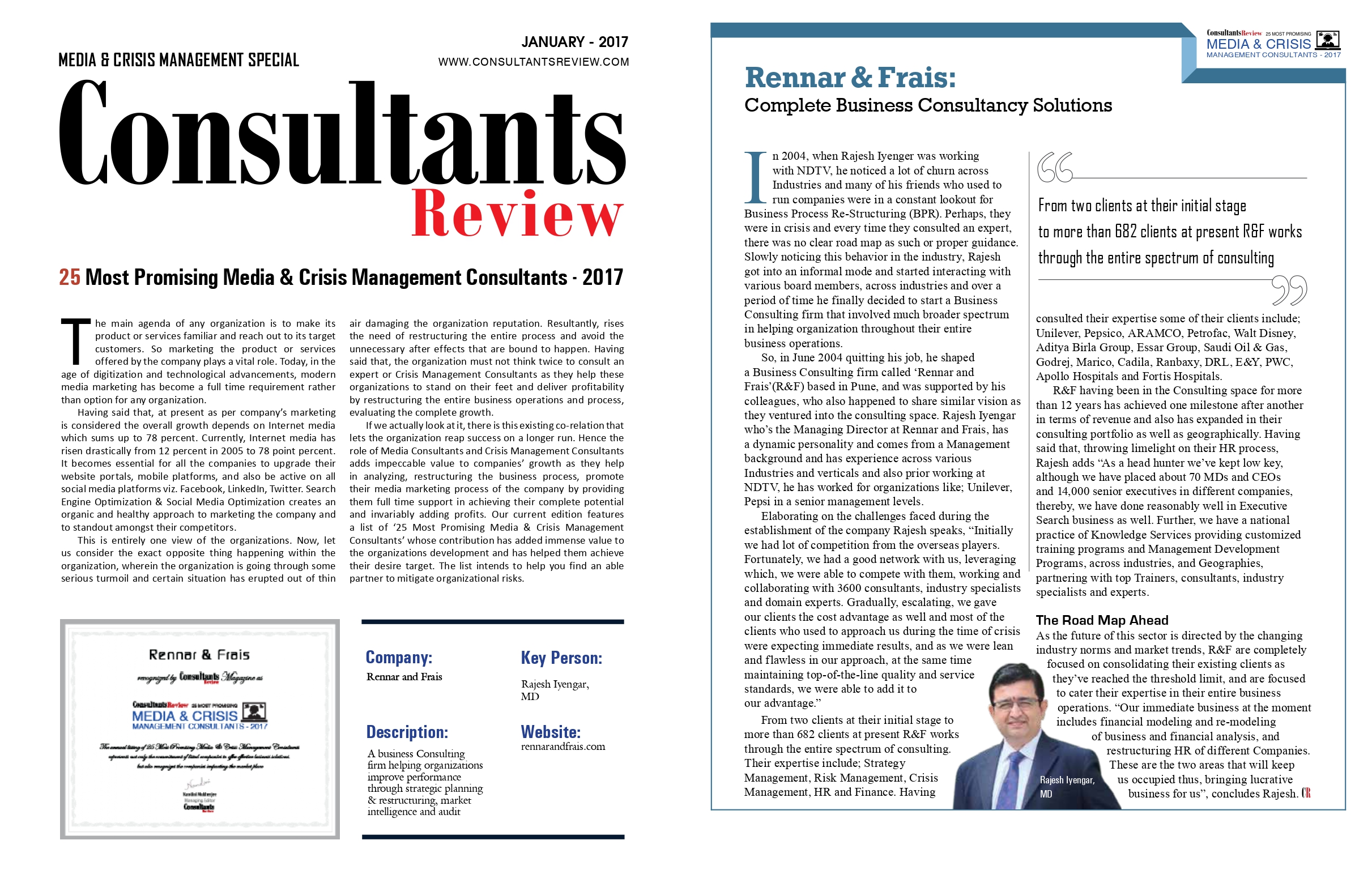 "RENNAR & FRAIS recognaized by CONSULTANTS REVIEW MAGAZINE as Most promising MEDIA & CRISIS MANAGEMENT CONSULTANTS -2017"